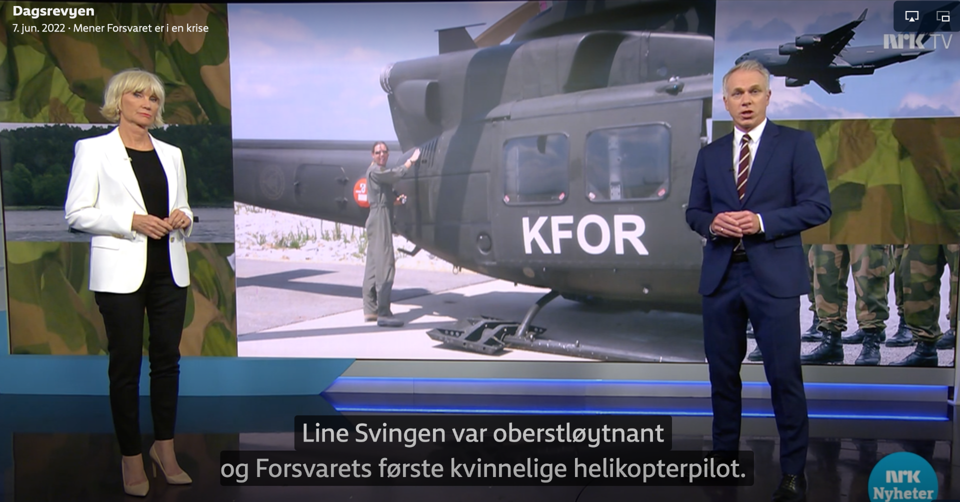 Line Svingen har delt sin historie i både TV, radio og podcaster. Som Norges første kvinnelige militære helikopterflyger og foredragsholder innen ledelse, arbeidsmiljø og mot, blir hennes erfaringer stadig etterspurt i media.